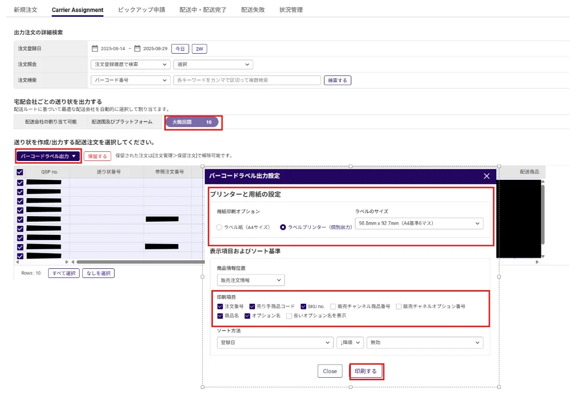スマートシップに注文を登録した後、センターに入庫するためのラベルです。