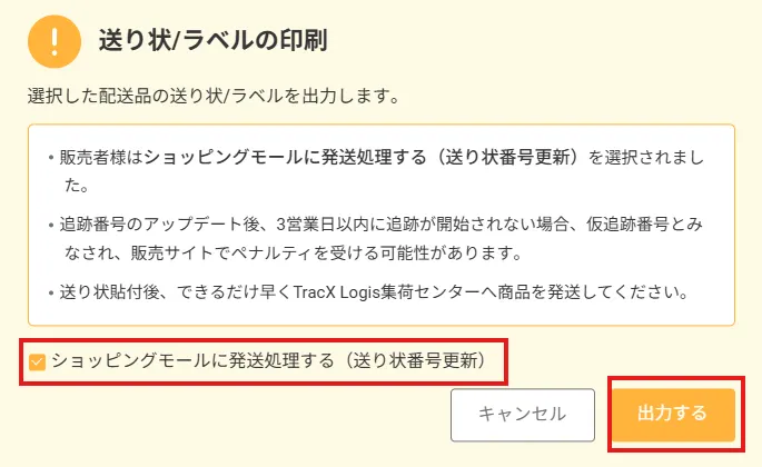 基本的にセンター入庫時にサイト上で「配送中」に変更されますが、[ショッピングモールに発送処理する] を選択した場合、バーコードラベルの出力と同時に「配送中」に変更されます。