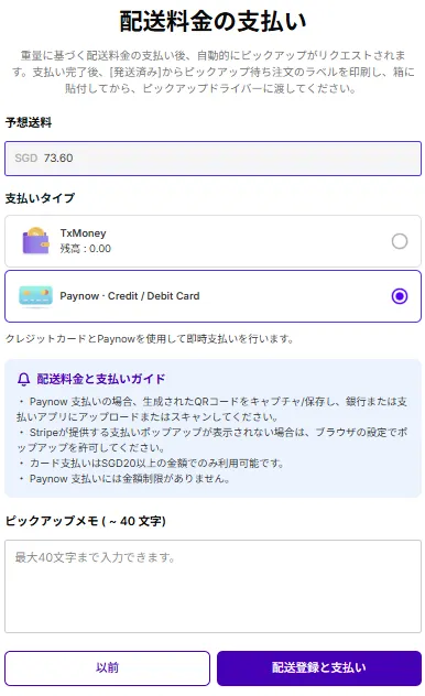 支払いが完了するとピックアップ予約が確定され、ラベルの出力後にボックスに添付する必要があります。