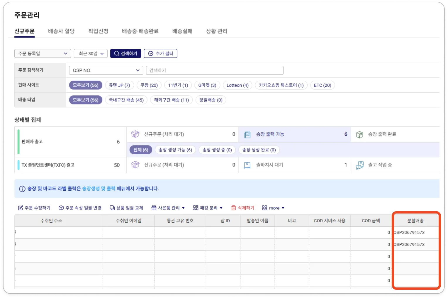 分離されたパッキングの有無は、[分割配送]フィールドで確認できます。