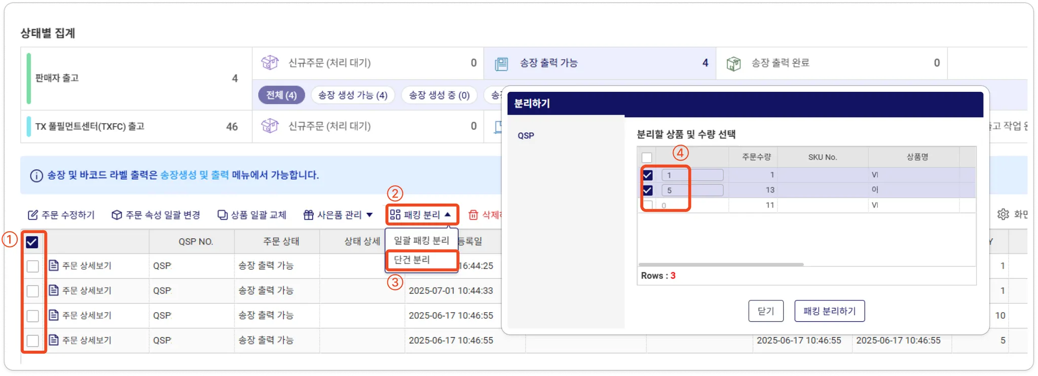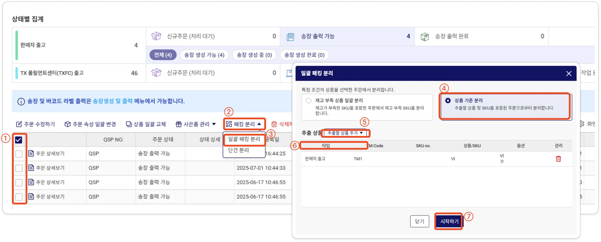 1つのパッキング番号(QSP)にまとめられている場合に、分離して出荷を行う際の手順。