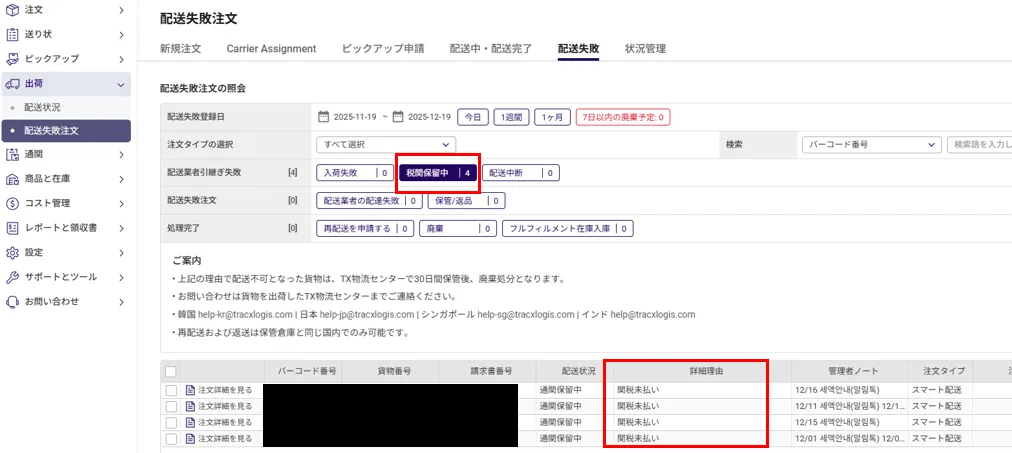 配送失敗注文画面から税関保留中の件が表示されます。