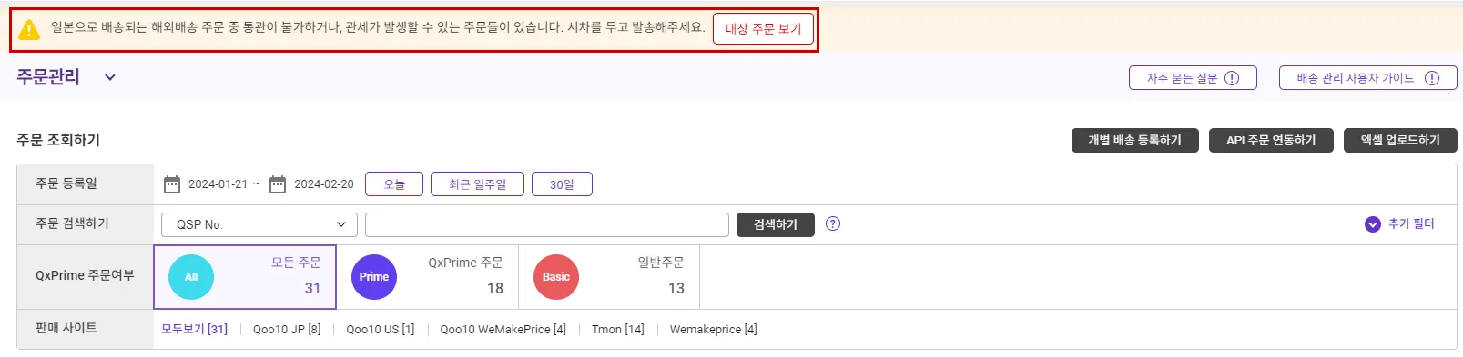 日本向けの注文登録時に、通関不可または関税発生が予想される注文をお知らせする機能です。