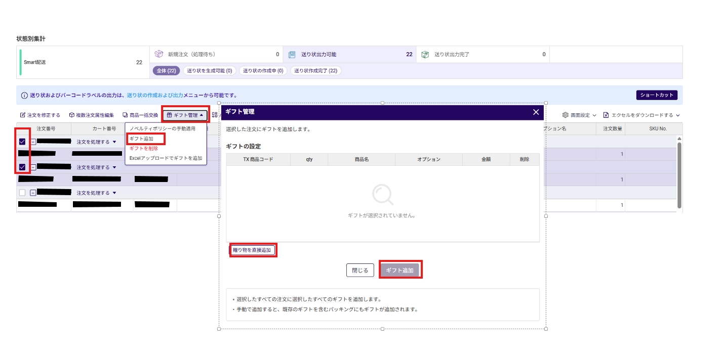 ギフト設定後 [注文 → 注文管理] メニュー接続