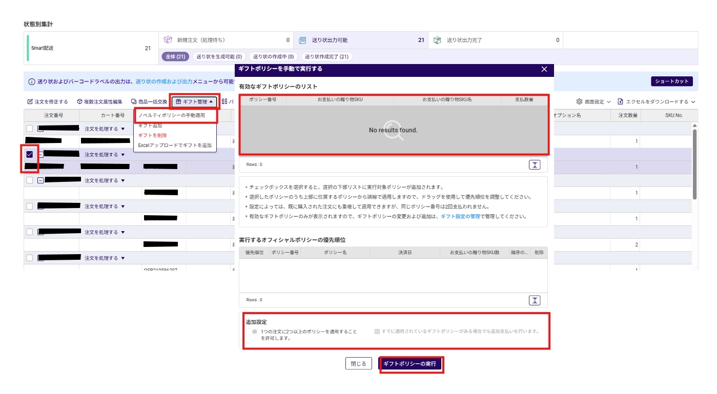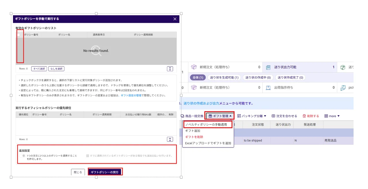 ② [ギフト管理 → ノベルティポリシーの手動適用] 選択