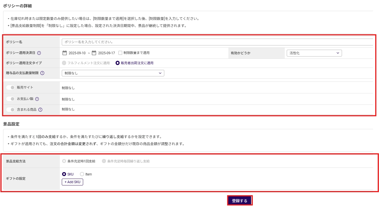 ギフト適用設定および詳細ポリシー設定により、ギフトを追加できます。