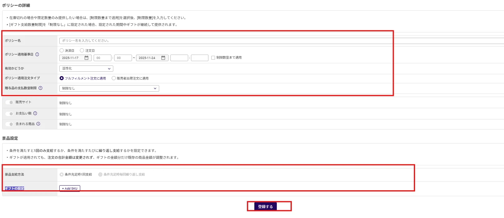 ギフト適用設定および詳細ポリシー設定を通じて、ギフトを追加することができます。