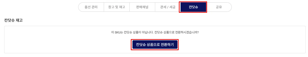 韓ダッシュ在庫設定方法 : SKU選択→[韓ダッシュ]タブ→[韓ダッシュ商品に切り替える]で韓ダッシュ商品に設定進行。