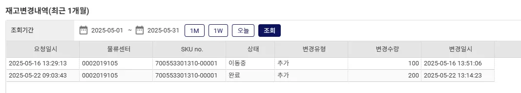 韓カンダッシュ在庫数量変更状態確認 : [在庫変更履歴]を使用して、最近1ヶ月および現在の状態を確認できます。