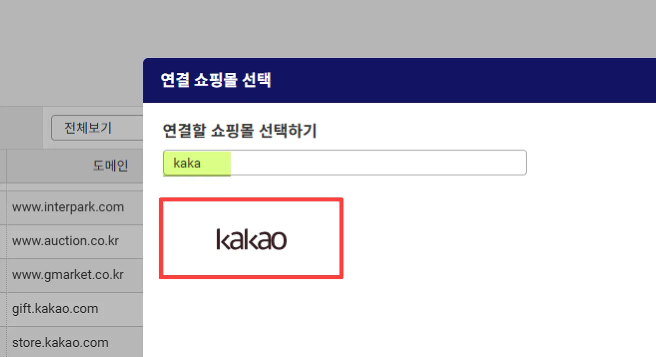 연결할 쇼핑사이트를 선택합니다. 빠르게 찾기 위해서는 쇼핑 사이트 이름의 일부만 타이핑하여 검색하면 빠르게 찾을 수 있습니다.