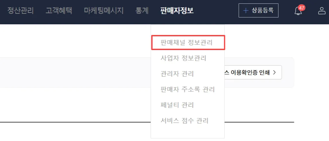톡스토어 판매자센터 혹은 선물하기 판매자센터에 접속하신 후, 오른쪽 상단 판매자 정보를 클릭한 후, 펼쳐지는 메뉴에서 ”판매채널 정보관리”를 선택하여 진입합니다.
