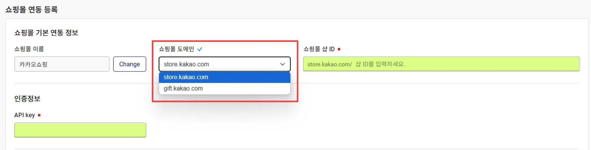 쇼핑몰 샵 ID 란에 설정하신 카카오 샵 ID를 입력합니다.