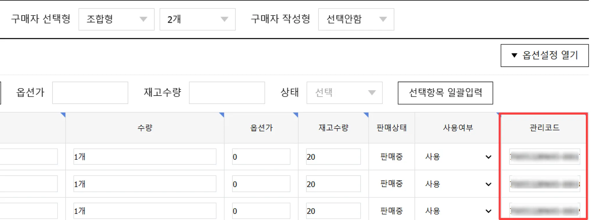 옵션이 있는 선택 상품의 경우 “조합형” 옵션의 “관리코드”를 입력하세요.