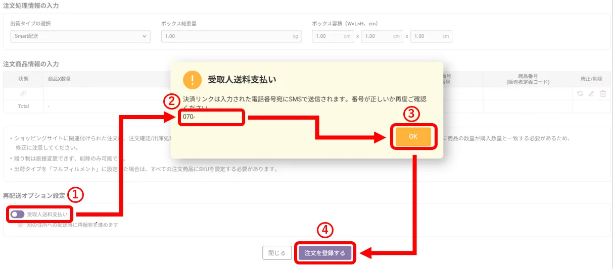 ① 「他の住所に配送を登録」選択⇒「受取人情報」確認⇒”再配送オプション設定”の「受取人送料支払い」選択