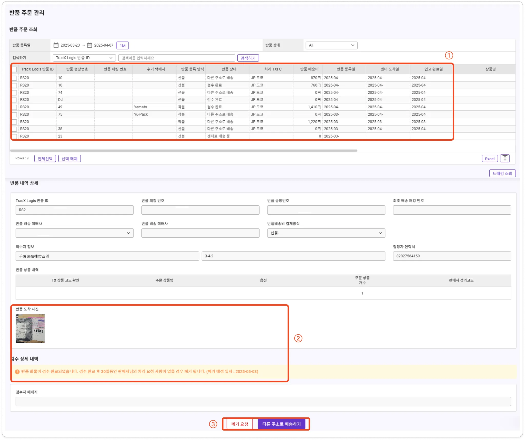 検品完了 | 返品貨物がフルフィルメント商品、または「詳細検品依頼」後に検品完了となった状態です。 | 別住所へ配送、廃棄、在庫処理(フルフィルメントのみ) |