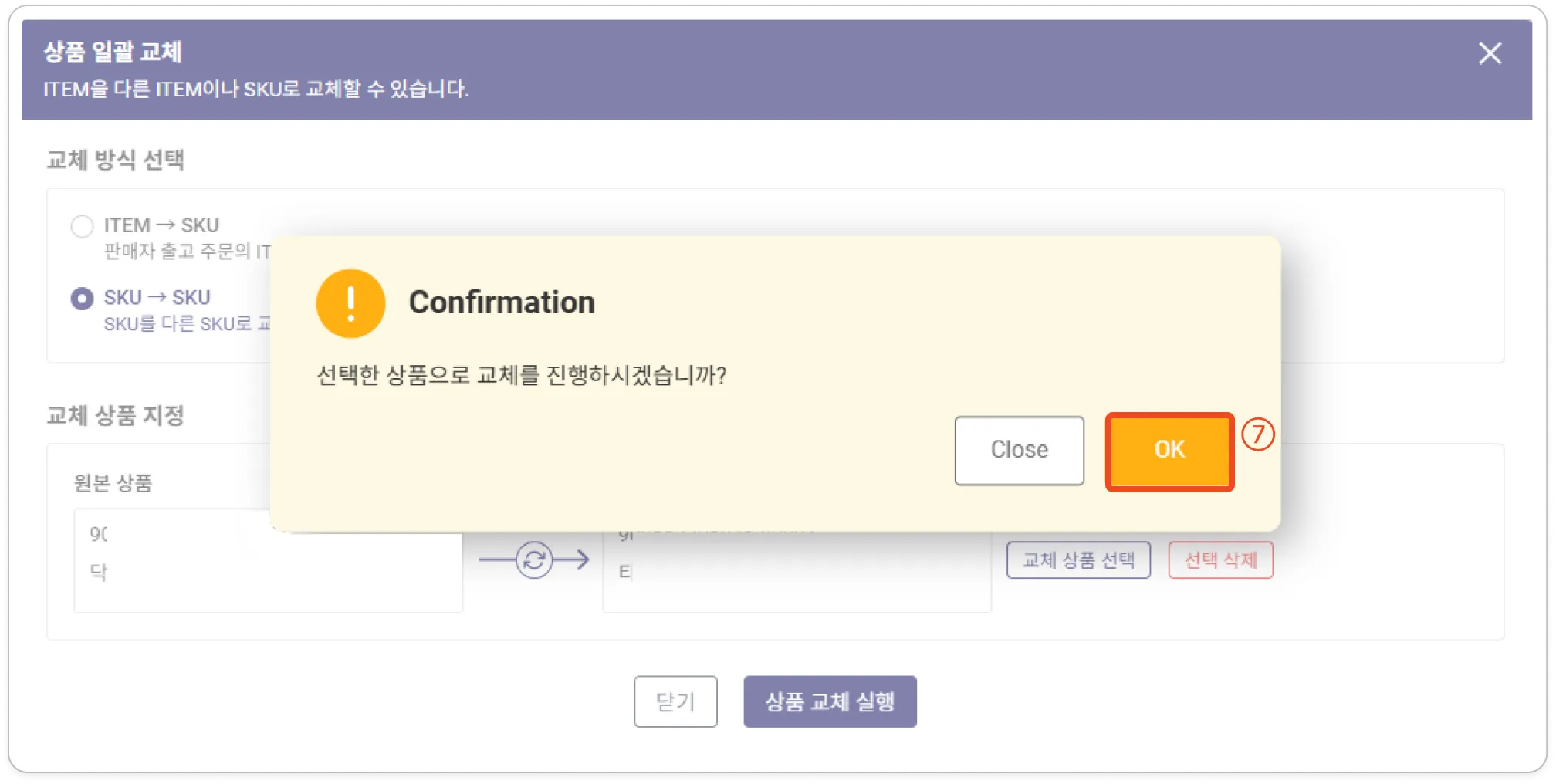 ⑤「交換商品選択」にて、元の商品から交換するSKUを選択
