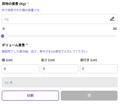 入力された値で自動計算された体積重量(Kg)が表示されます。