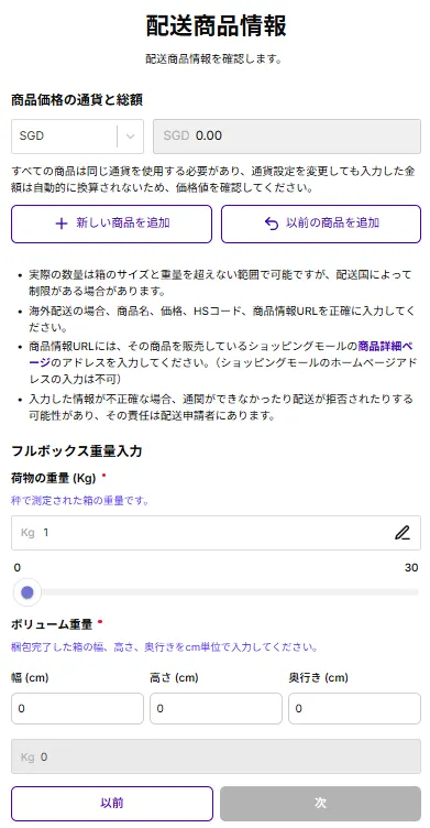 この画面では、配送する商品情報を入力します。すべての項目は正確に入力する必要があり、誤って入力すると通関遅れまたは配送不可が発生する可能性があります。