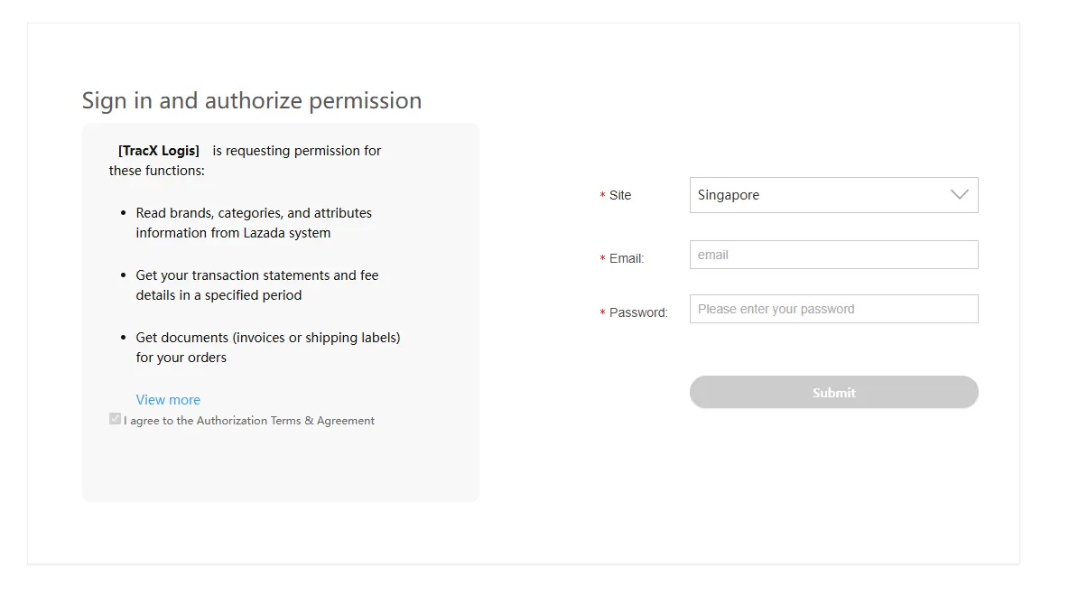 “auth.lazada.com” 주소의 팝업창이 열리면 샵이 운영되는 판매 국가를 선택한 뒤, Lazada Seller Center 로그인 아이디와 비밀번호를 입력하고 “Submit”를 클릭하세요.