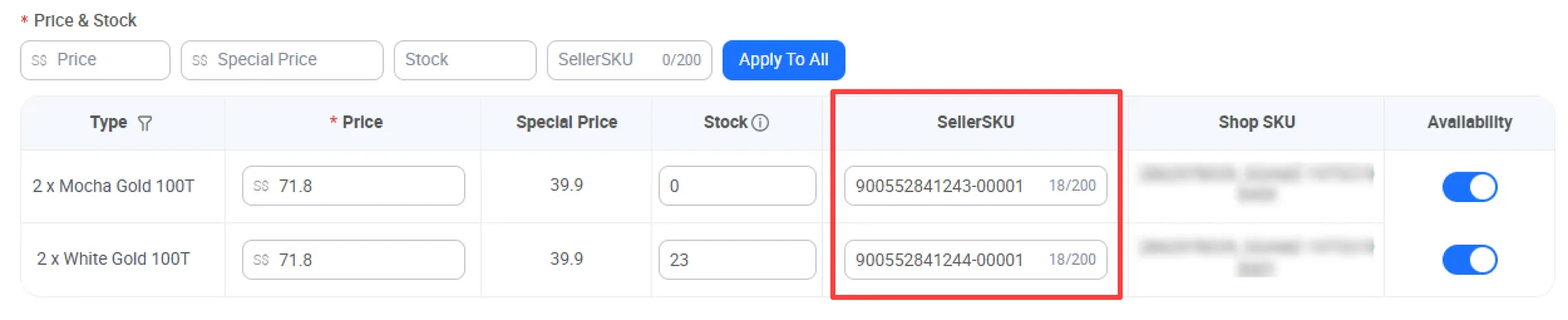 상품 Variant 별로 “SellerSKU”를 입력합니다.