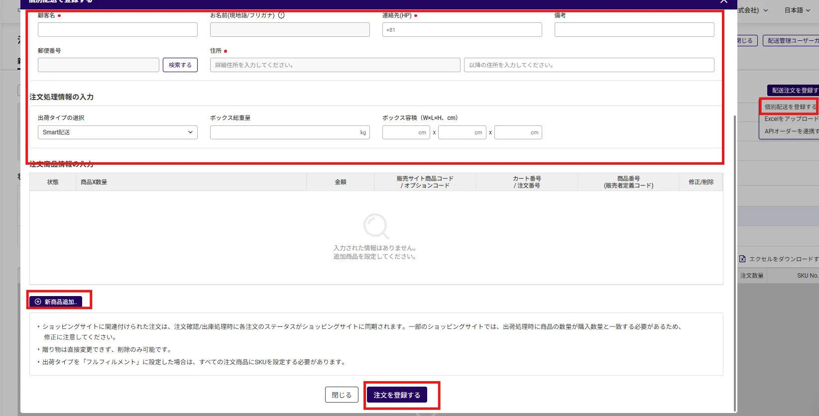 (2-2) 外部サイトの発送注文一括登録での登録方法