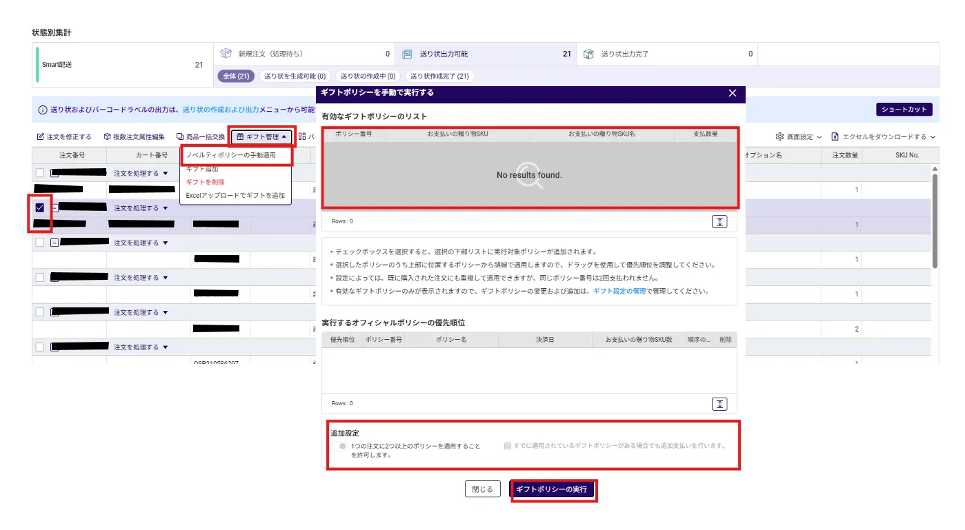 ② [ギフト管理 → ノベルティポリシーの手動適用] 選択