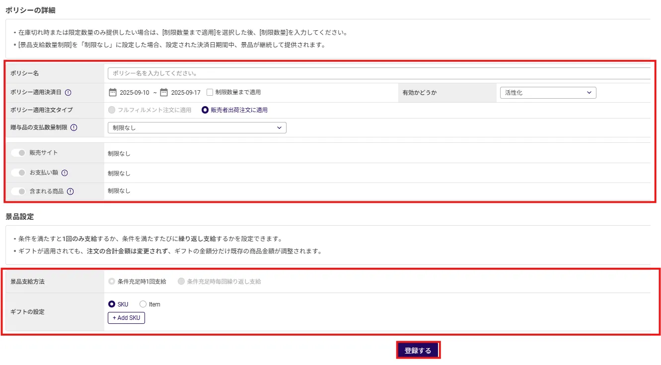 ギフト適用設定および詳細ポリシー設定により、ギフトを追加できます。