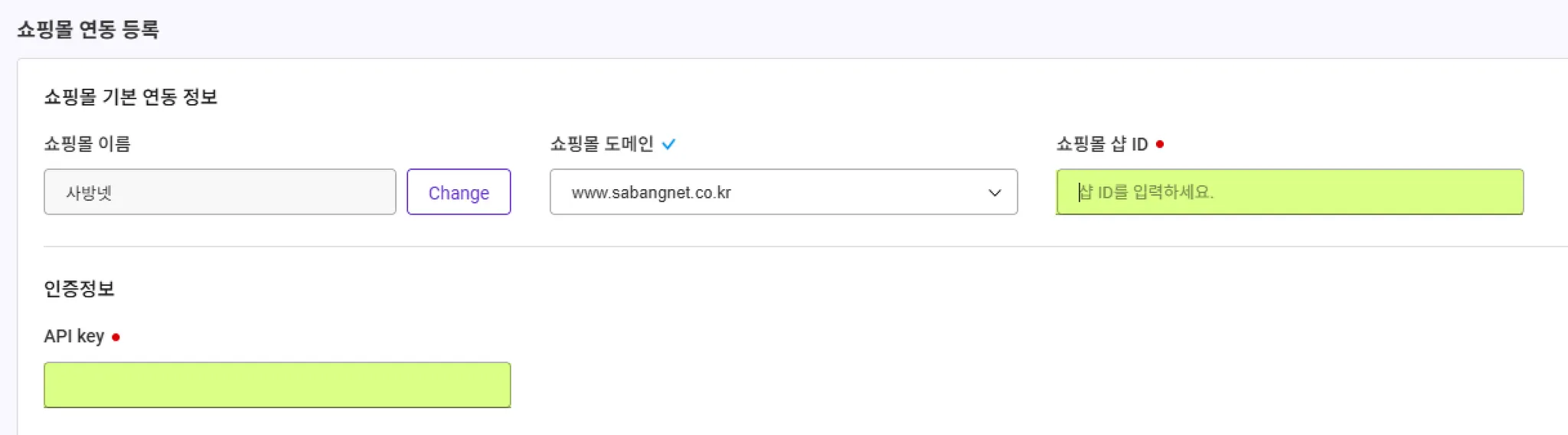 쇼핑몰 샵 ID 란에 ”샵 ID” 값을 입력합니다.