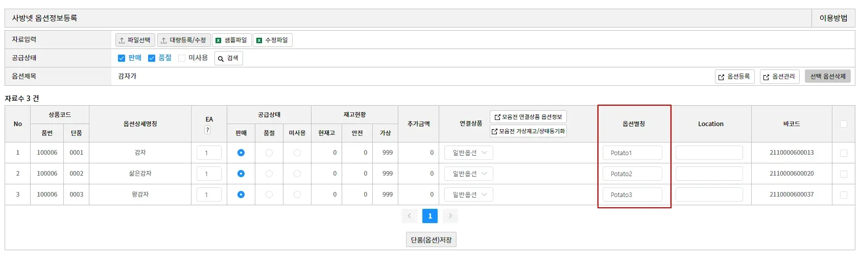 옵션에 판매자 코드가 있는 경우, 옵션을 선택하고 판매자 정의코드에 판매자 코드를 등록해주세요.