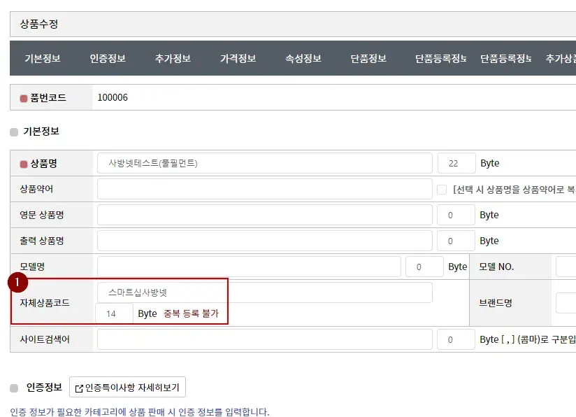 옵션이 없는 단일 상품의 경우 “자체상품코드”를 입력합니다.