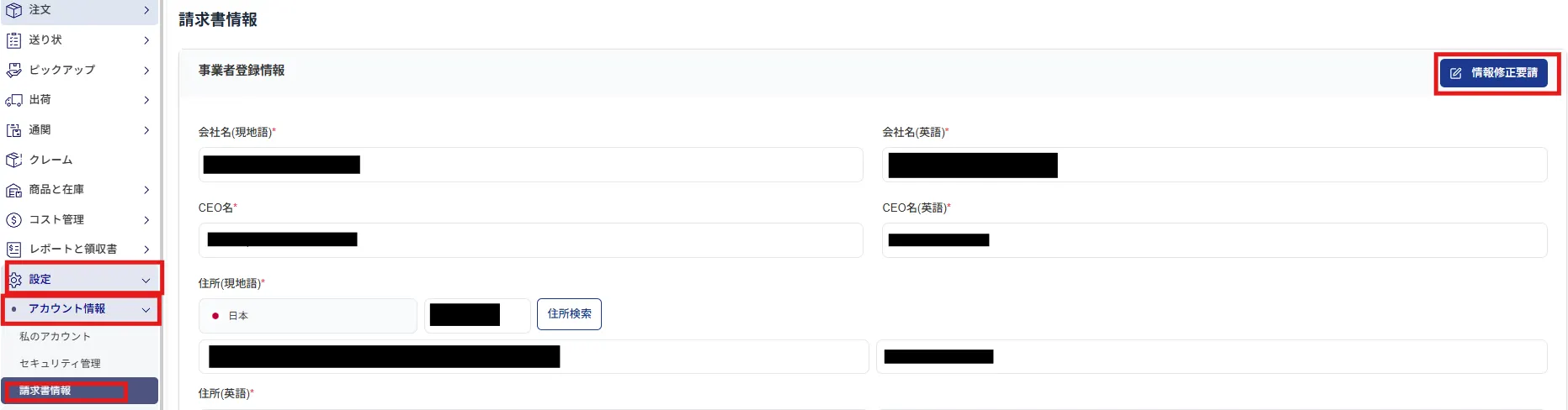 [設定] > [アカウント情報] > [請求書情報] > [情報修正要請]