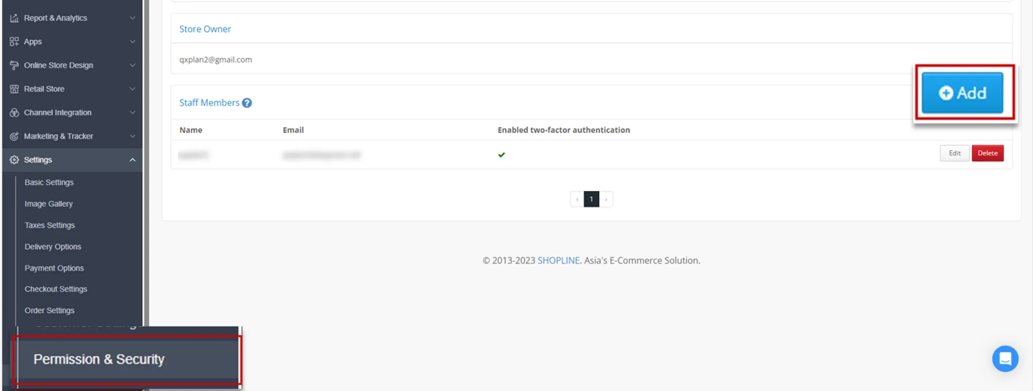 샵라인 어드민에 접속하신 후, 좌측 하단 메뉴의 Permission & Security 메뉴로 진입합니다.