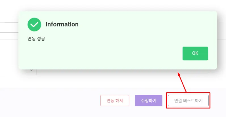 등록이 완료된 후, 정상적인 API 통신이 가능한지 확인하기 위해 [연결 테스트] 버튼을 클릭하세요.