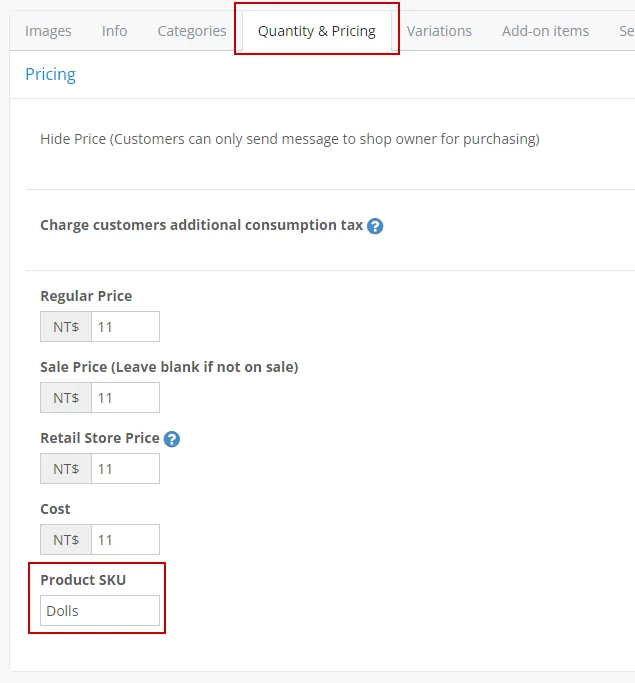 옵션이 없는 단일 상품이라면 Quantity & Pricing 탭 하위에 있는 Product SKU에 입력합니다.