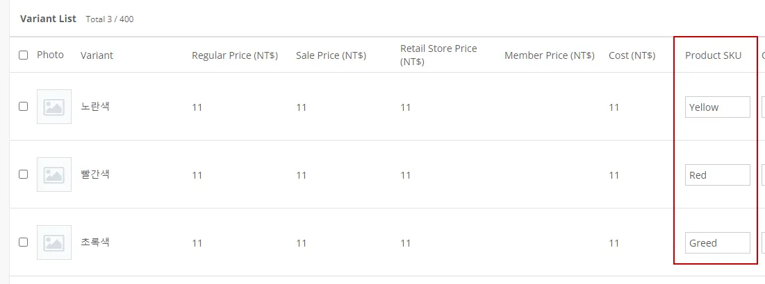옵션이 있는 선택형 상품이라면 Variants 탭에 옵션 상품별로 Product SKU를 입력합니다.