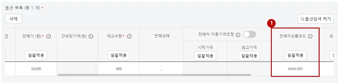 옵션에 판매자 코드가 있는 경우, 옵션을 선택하고 판매자 정의코드에 판매자 코드를 등록해주세요.