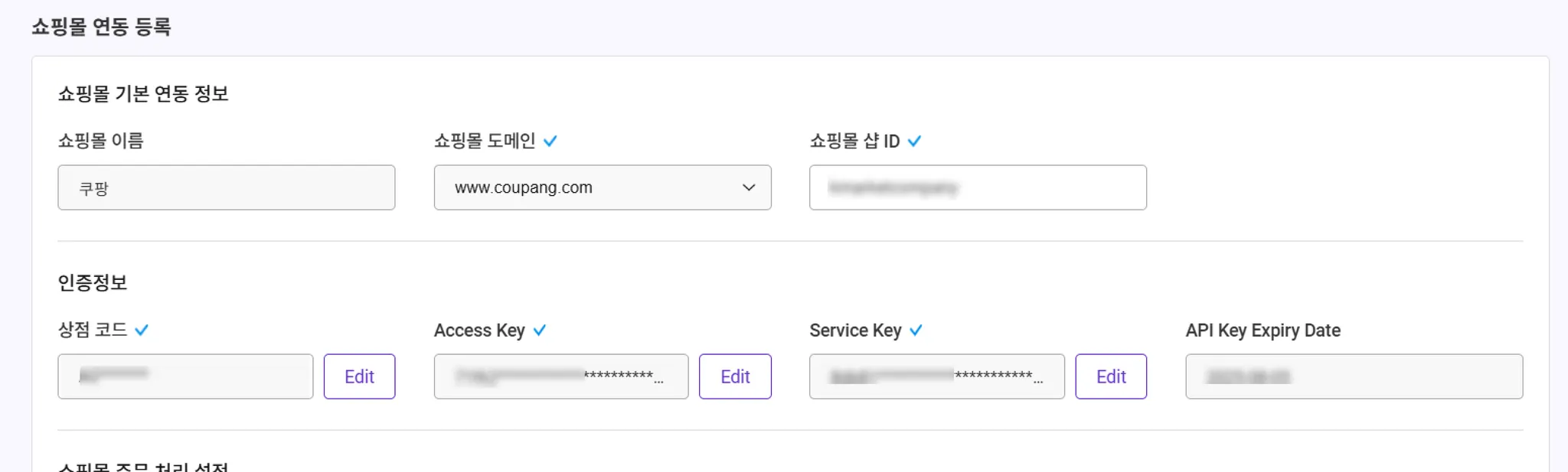 주문 > 쇼핑몰 연동 > 쇼핑몰 API 설정