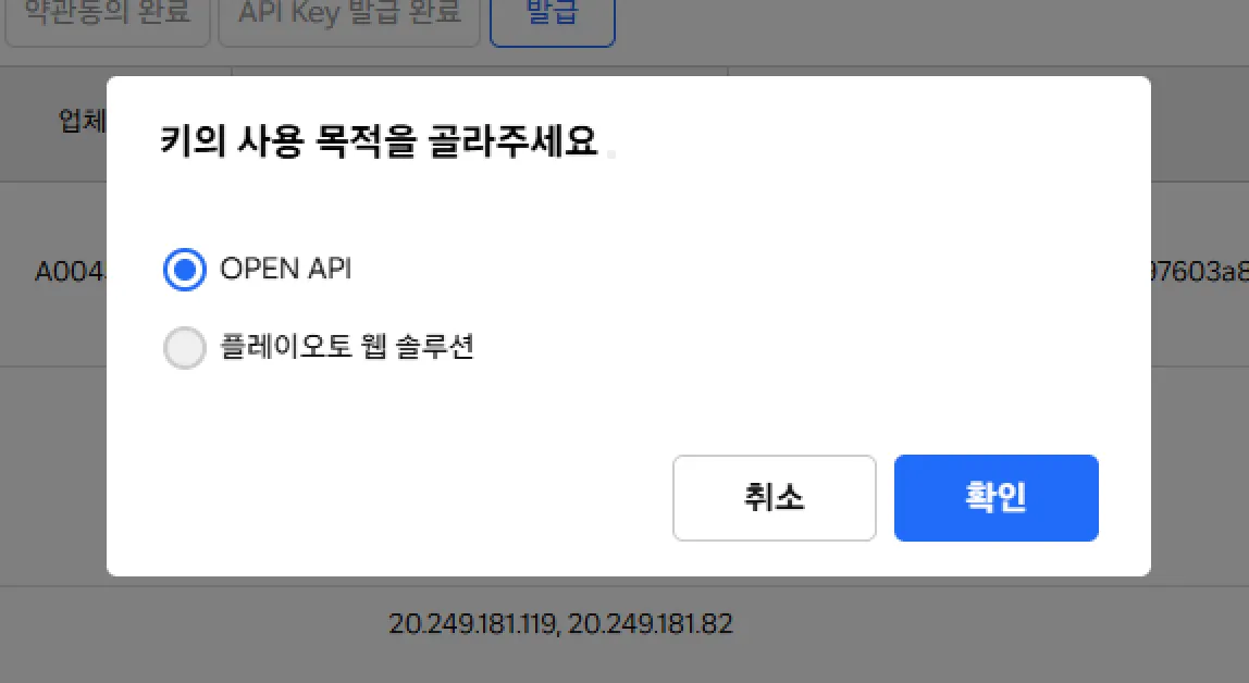 키의 사용 목적으로는 ”OPEN API”를 선택하세요.