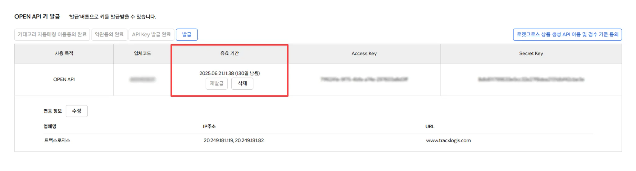 API가 발급되면 업체코드, 액세스 키, 비밀 키가 발급됩니다. 스마트십에 이 정보를 등록하여 쿠팡 API를 연결할 수 있습니다.