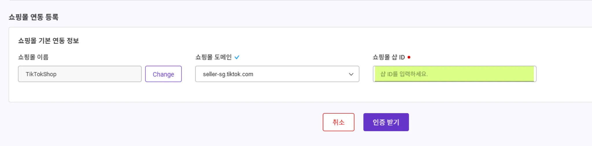 쇼핑몰 샵 ID 란에 ”샵 ID” 값을 입력합니다.