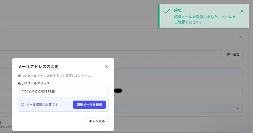 認証メールの送信後の成功と表示されても、変更は完了しておりません。