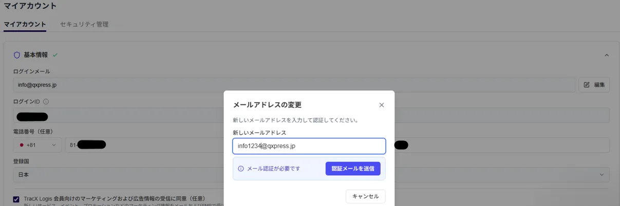 ログインメールの「編集」を押下して、新しいメールIDを入力してください。