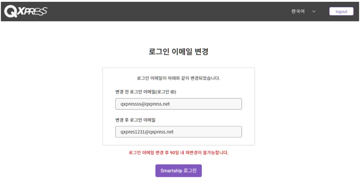 リンククリックと同時に新しいIDに変更され、既存のIDでログインしたページは自動的にログアウト処理されます。 [Smartshipログイン]ボタンを押して変更されたIDでログインした後、スマートシップをご利用ください。