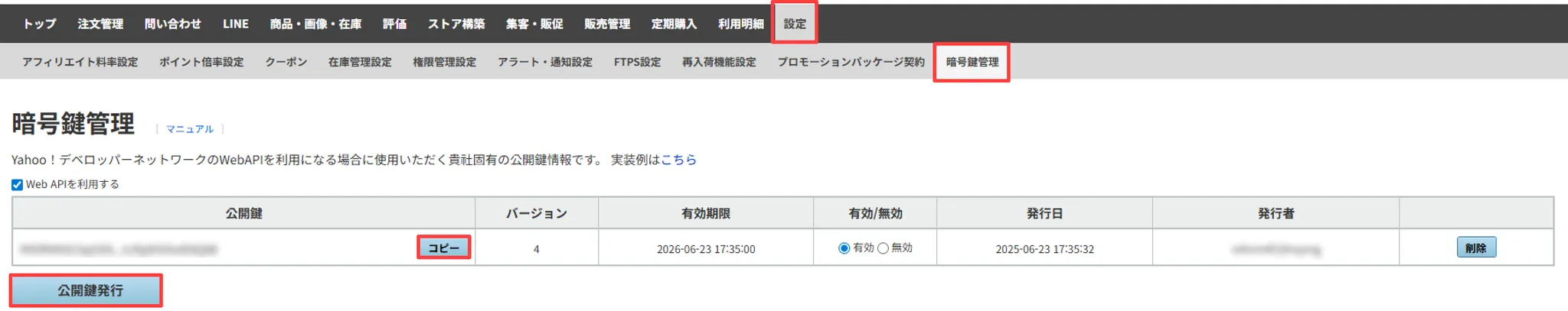 설정 > 암호키 관리에서 [공개키 발행] 를 클릭하여 공개 키를 발행합니다.