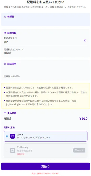 [TracxLogis] 佐藤**様, TracXLogis Japanです。 送り状番号:(パッキング番号) 商品名:**... 再配送の費用は下記のリンクからご確認お願いします。[https://txl.show/**] お問合せ先 https://tracxlogis.channel.io/home