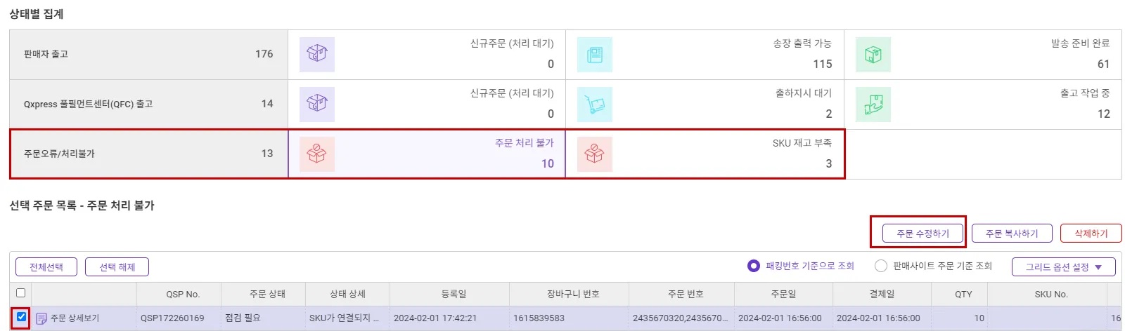 商品数量や金額、SKUの修正が必要な場合、注文は「注文エラー/処理不可」として分類されます。