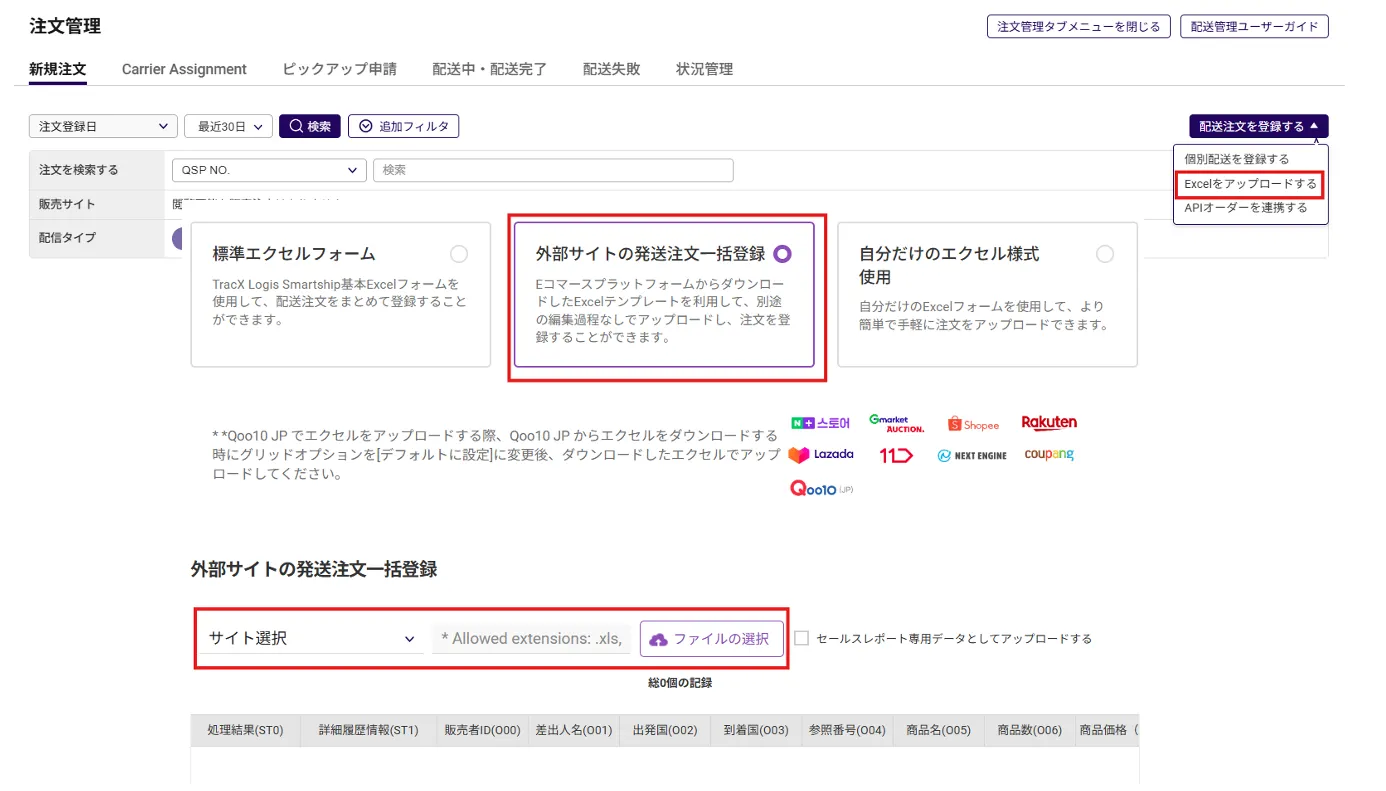(2-2) 外部サイトの発送注文一括登録 : ショッピングモールで提供されるExcel様式をアップロードする方式
