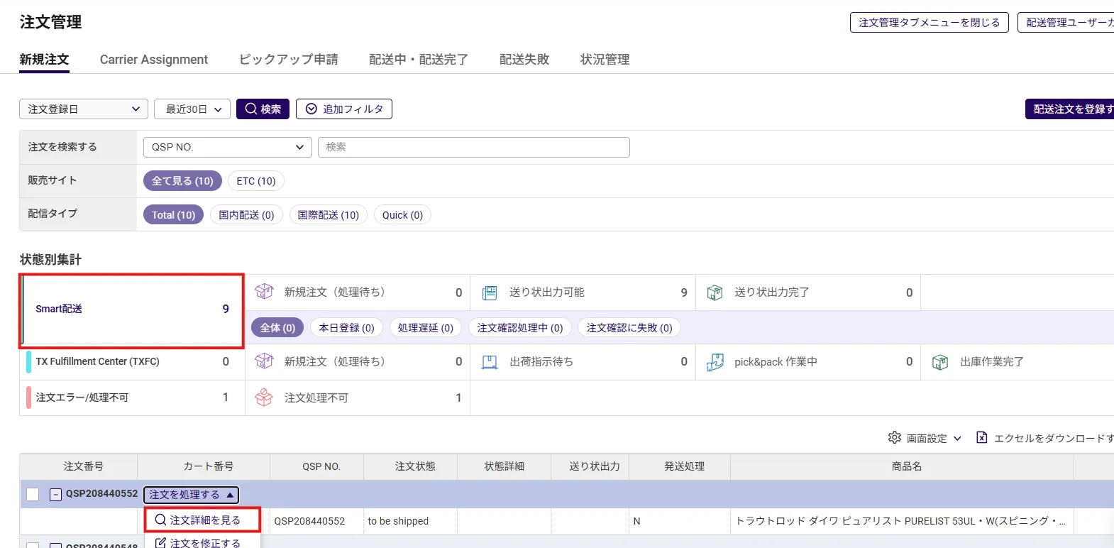 状態別集計で登録された注文件と詳細を確認できます。