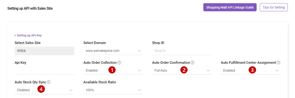 When issuing a sales site API KEY to connect to SmartShip, please refer to the information below and set the processing method for API integration orders.