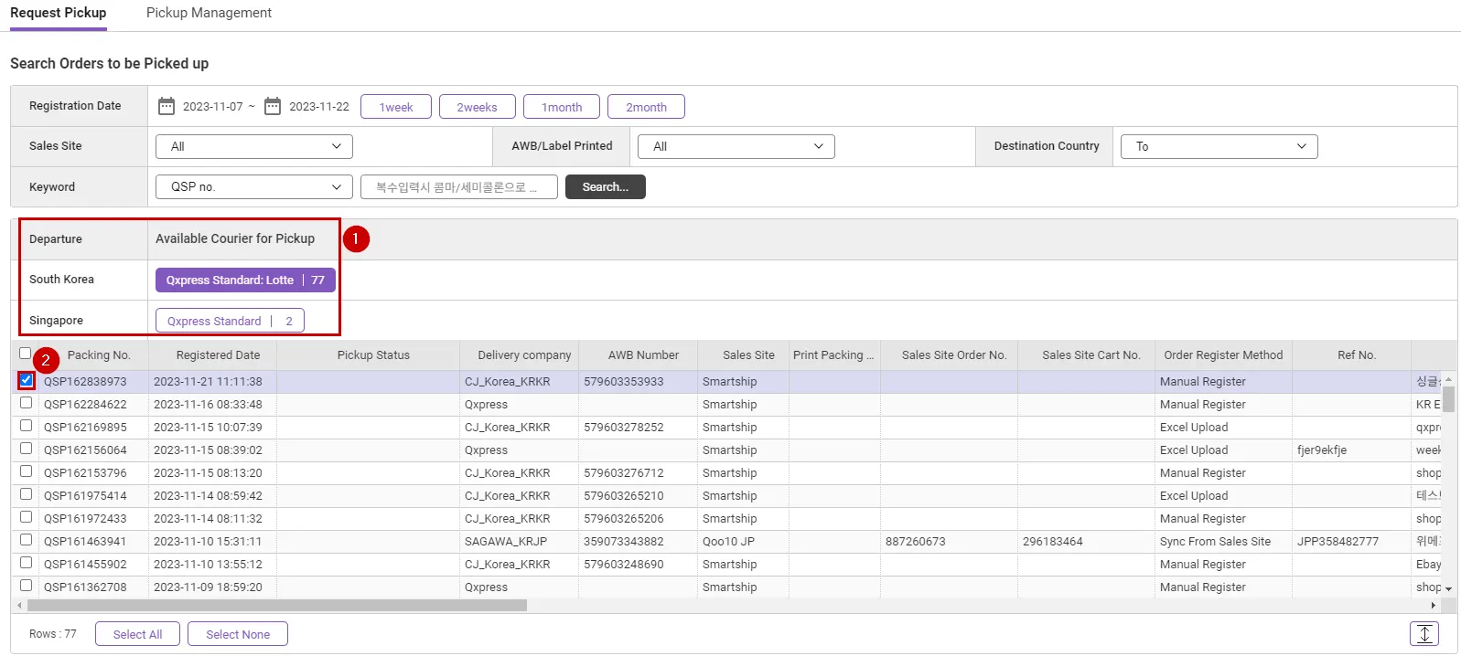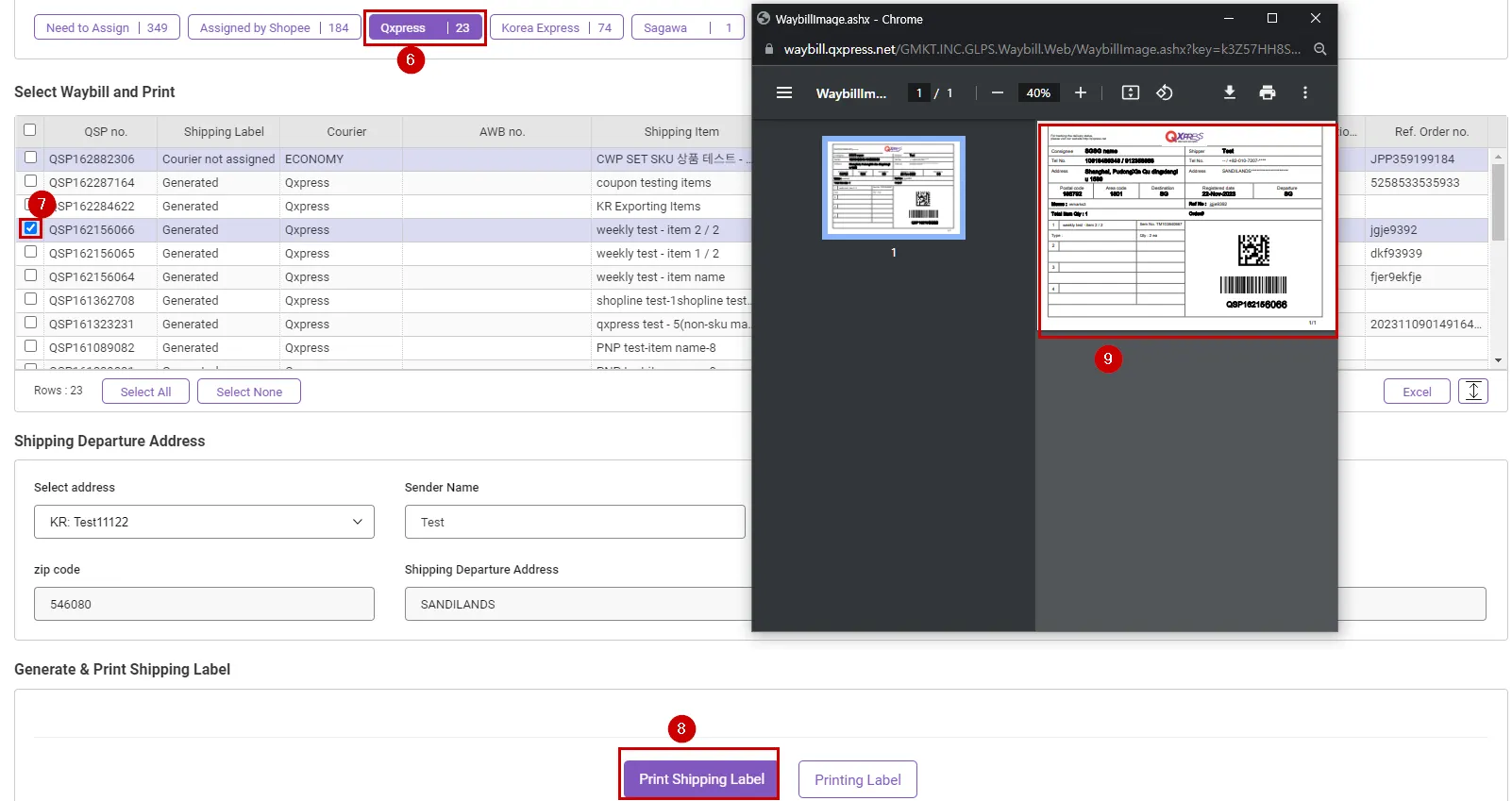(Tracx Logis is assigned as the default shipping company, and the existing QSP number is assigned as the shipping label number.)